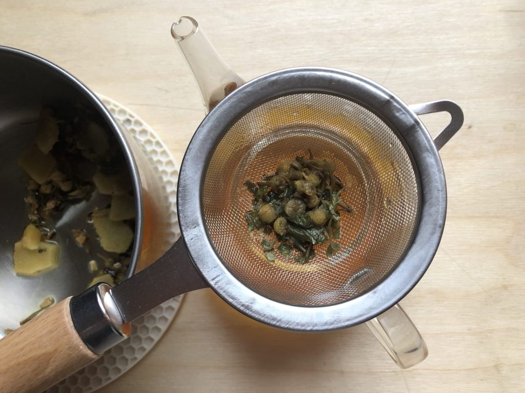 After this time, turn off the heat and add the lemon balm and chamomile.