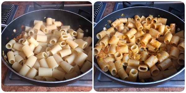 Meanwhile, cook the pasta in plenty of boiling salted water; drain it al dente and transfer it to the pan with the sauce. Stir well to combine the ingredients.