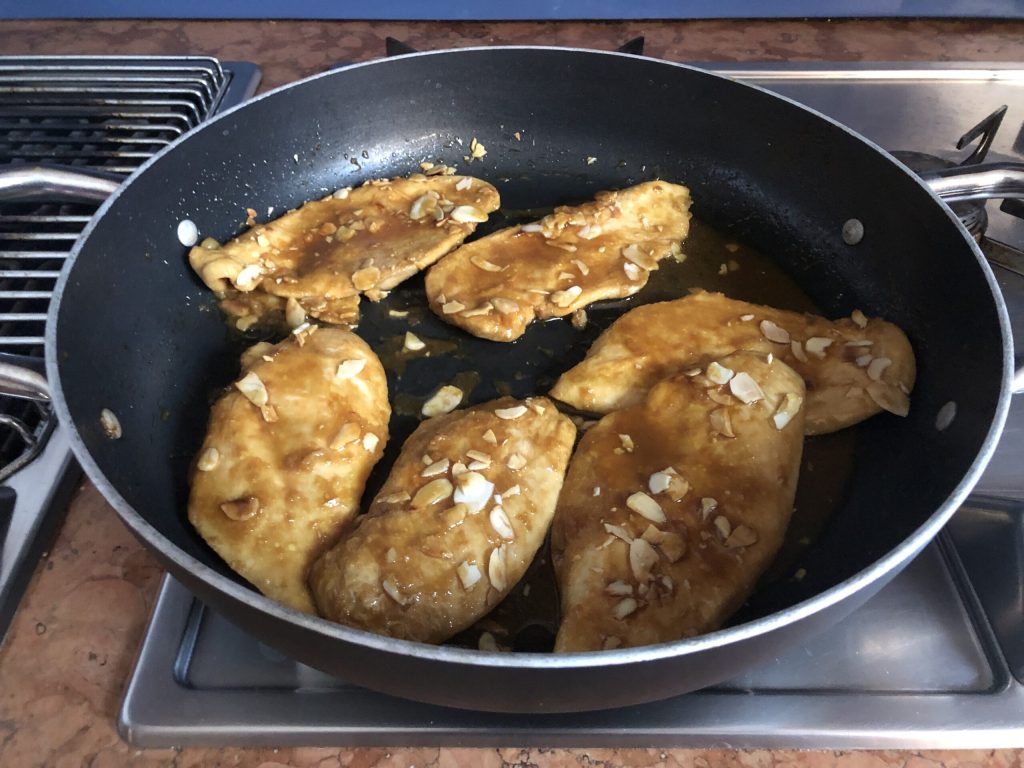 • After the marinating time, heat a roomy nonstick pan very well without any added fat. Drain the chicken slices and transfer them directly to the hot pan. Do not pat them dry, just drain. And don’t throw away the marinade liquid—we’ll use it later.