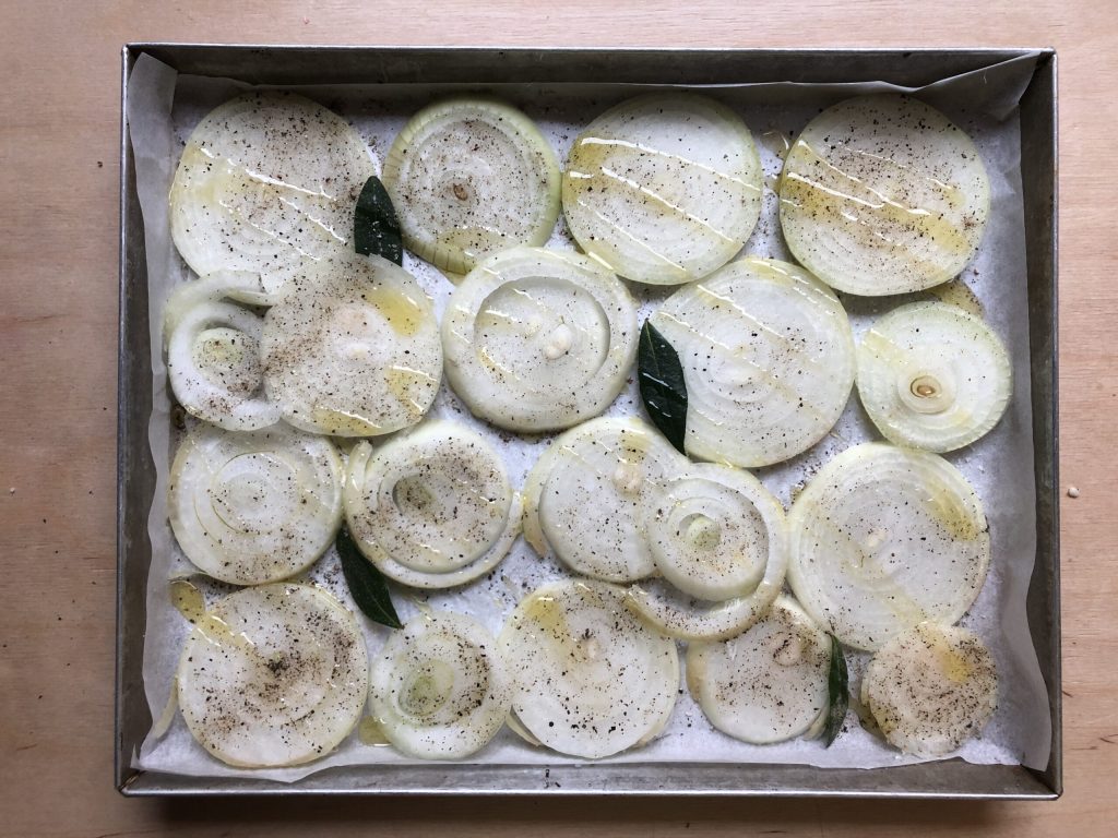 • Peel the onions and slice them into rings about 1/4 inch thick.