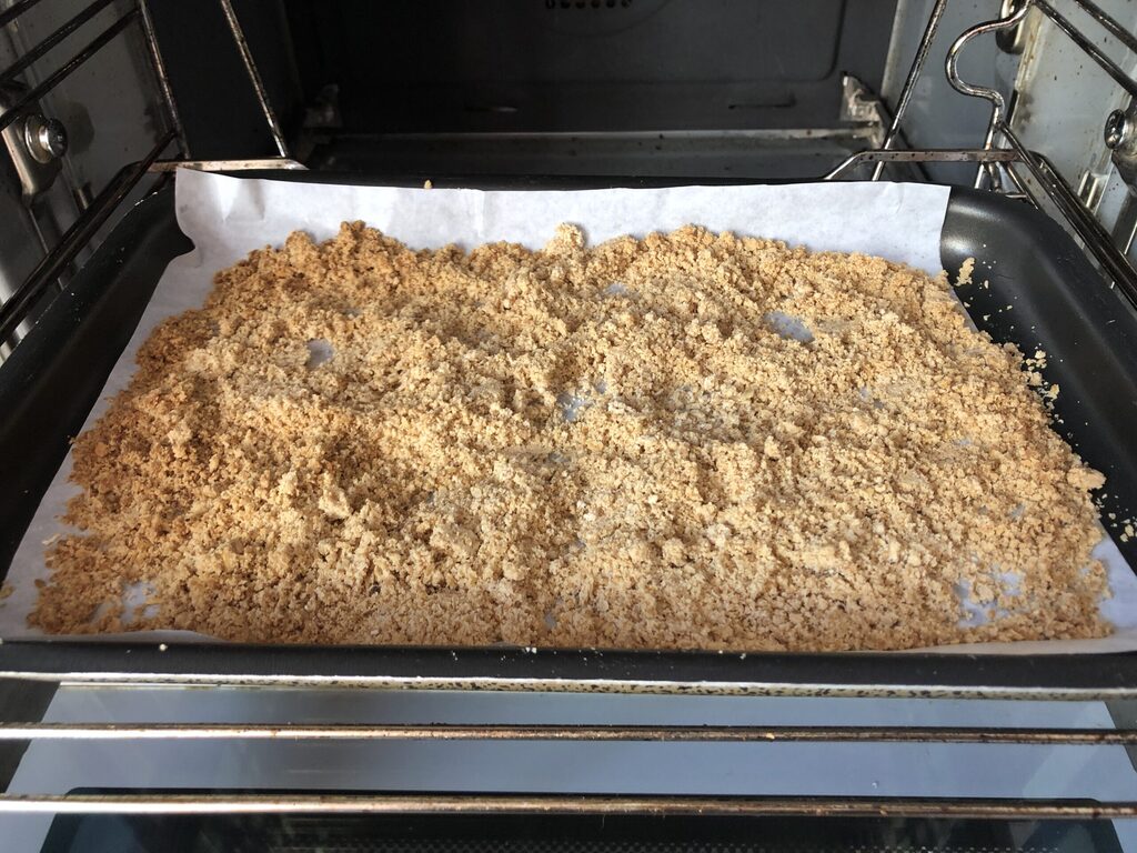 • Transfer it onto a baking tray lined with baking paper, spreading it evenly, and quickly mix it with your fingers.