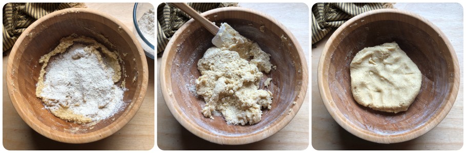 At this point, gradually add the dry ingredients and mix first with a spoon or a spatula and then with your hand. You should obtain a soft, homogeneous mixture, not sticky and easy to work with.