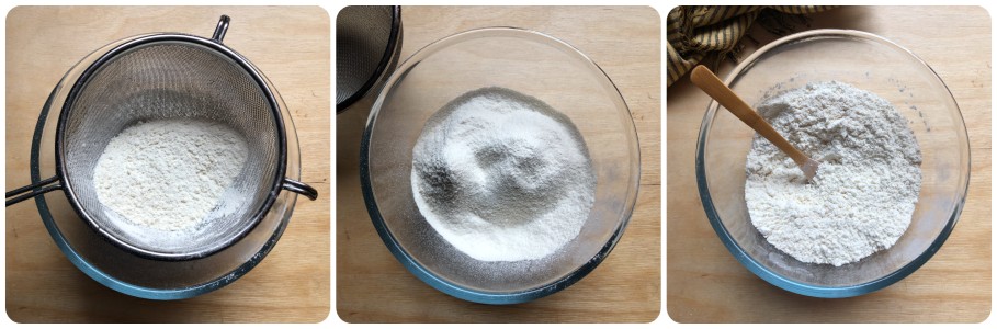 In a medium bowl sift, through a fine-mesh sieve, the flour together with the baking powder, the vanillin and the baking soda. Then add the desiccated coconut, a pinch of salt and mix.