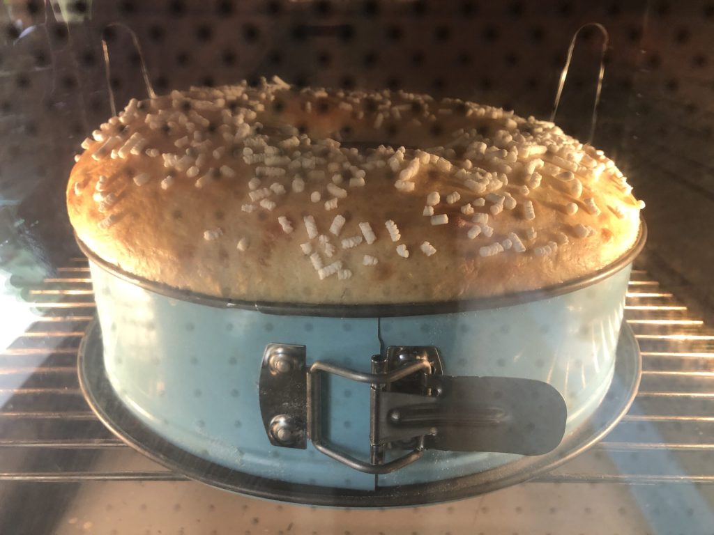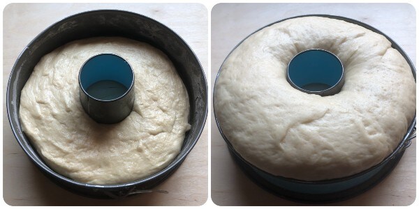 After this first rising time, transfer the dough to a 10-inch diameter bundt pan that has been previously buttered and floured, cover it with a clean cloth, and let it rise for another hour or so.