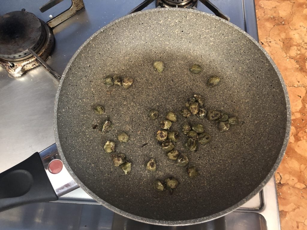 In the same pan, dry fry the capers until they become crispy: rinse them first under running water and dry them, patting with paper towels.