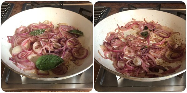 Then, drizzle the onion with vinegar, salt, and pepper to taste, and add the sage and bay leaves. Continue cooking on high heat for another two minutes, stirring often, then turn off the heat and let it cool.