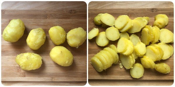 Boil them for about 15 minutes, then peel and slice them about 1/4 inch thick.
