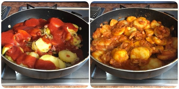 Finally, add the tomato puree and continue cooking over medium-low heat for about ten minutes, adding a few tablespoons of hot water when the sauce dries too much. When done, adjust the seasoning with salt and pepper. Stir often and very gently.