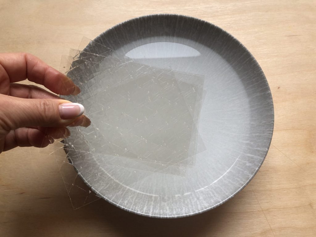 After the resting time in the fridge, gently detach the green gelatin block from the parchment paper using the tip of a knife.