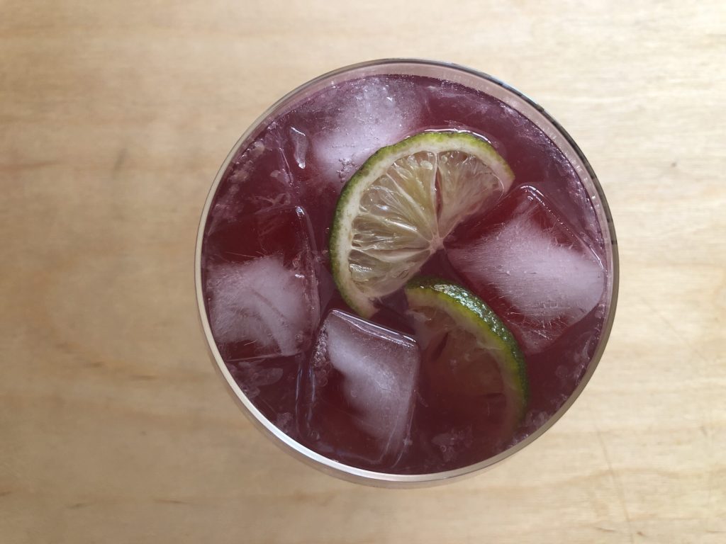 • Put the apple juice, cranberry juice, juice of half a lime, and a teaspoon of maple syrup in a shaker (or directly in a glass) and shake well until the syrup is perfectly dissolved.