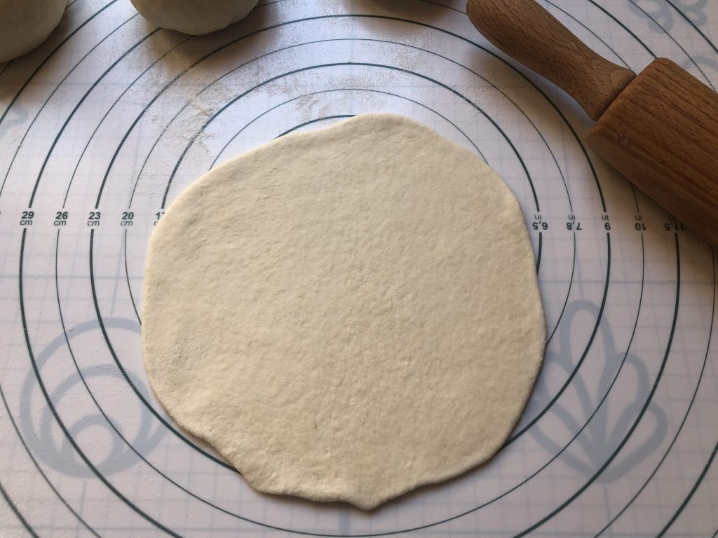 After this second rise, roll each ball with a rolling pin to form a thin circle.