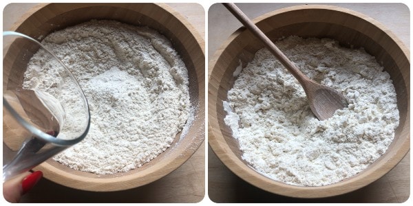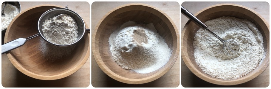 Sift the flour into a large bowl, add the dry yeast, and mix with a small hand whisk.