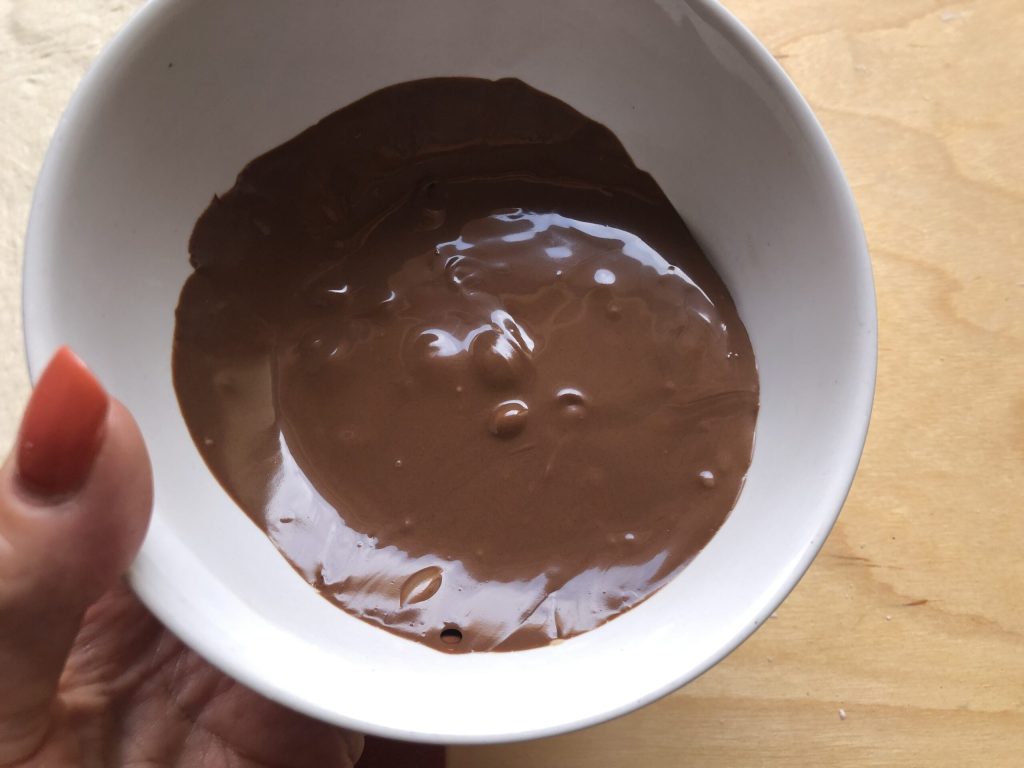 Lightly warm the Nutella to make it more fluid. I microwaved it for a few seconds. Alternatively, you can warm it in a bain-marie. How much? You can go by eye depending on your personal taste and your sweet tooth. I, being an unapologetic sweet tooth, was generous.