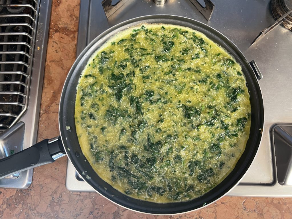 Heat the pan again, adding a little oil if necessary. I didn’t do it because it was still coated with the oil from the sauté. Once it’s hot, pour in the egg mixture and level it with a spatula.