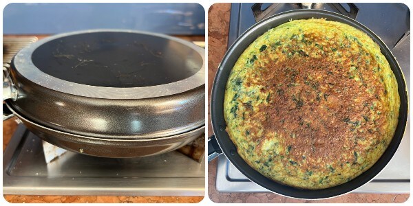 Lower the heat, cover, and cook the omelet until the base is well set and golden. Flip it and continue cooking on the other side. This will take about 15 minutes over very low heat.