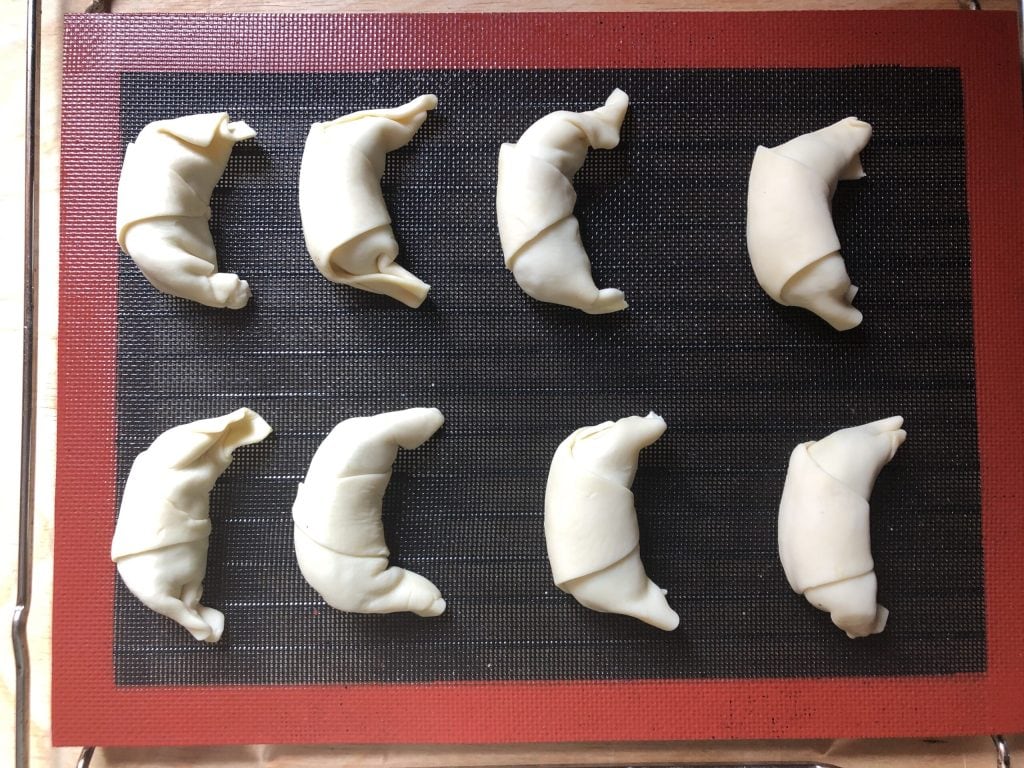 Fold the puff pastry over the filling, trying to seal the edges well, then roll up the triangle and curve the ends downwards to give it the classic croissant shape.