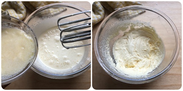 Then pour the warm melted butter in a thin stream while continuing to beat the mixture with the electric mixer.