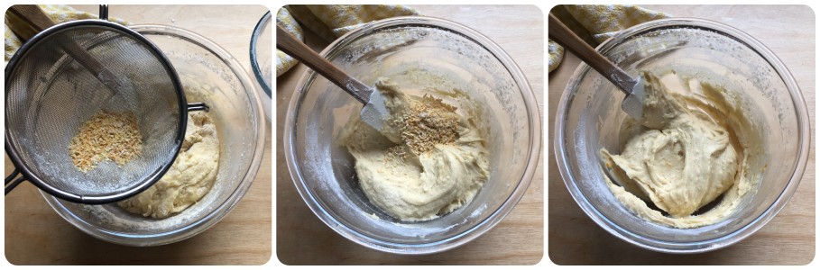 At this point, gradually add the dry ingredients by sifting them through a fine-mesh sieve and folding them in with a spatula.