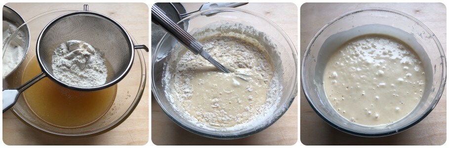 Gradually add the dry ingredients by sifting them through a fine-mesh sieve and incorporate them with the whisk.
