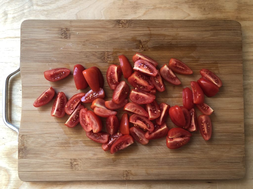 Meanwhile, wash the cherry tomatoes and cut them into quarters or halves if they are small.