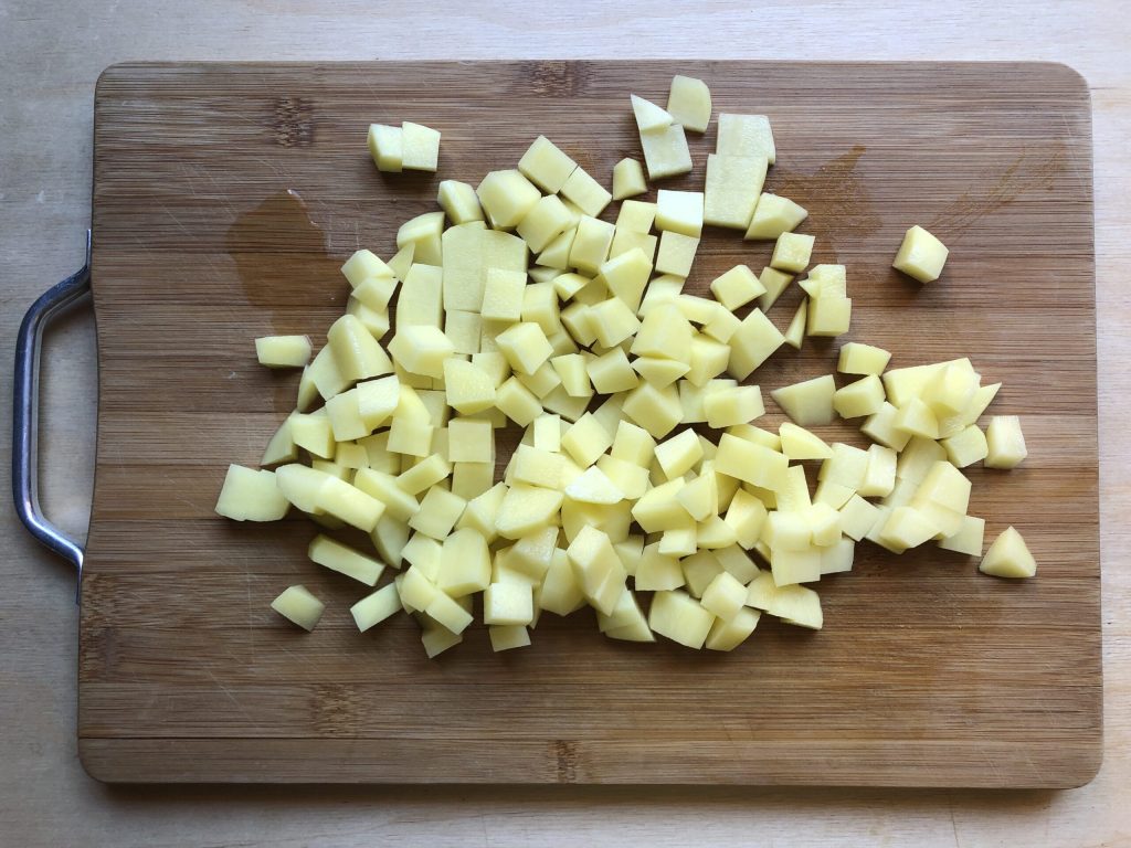 Meanwhile, cook the pasta in plenty of salted boiling water, drain it al dente, saving a bit of water, and transfer it into the sauce pan. Mix well to combine all ingredients. Finally, add the potato cubes. At this point, I didn’t stir anymore to keep the potatoes their color, creating a nice color contrast.