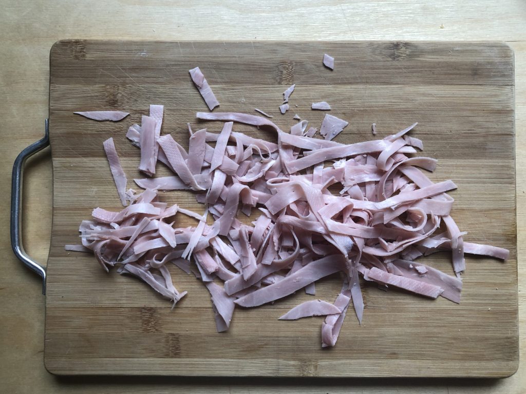 • In a large pan, heat a few tablespoons of oil and sauté the finely chopped onion. Let it sizzle for a moment, then add the strips of cooked ham and brown them just for a minute.