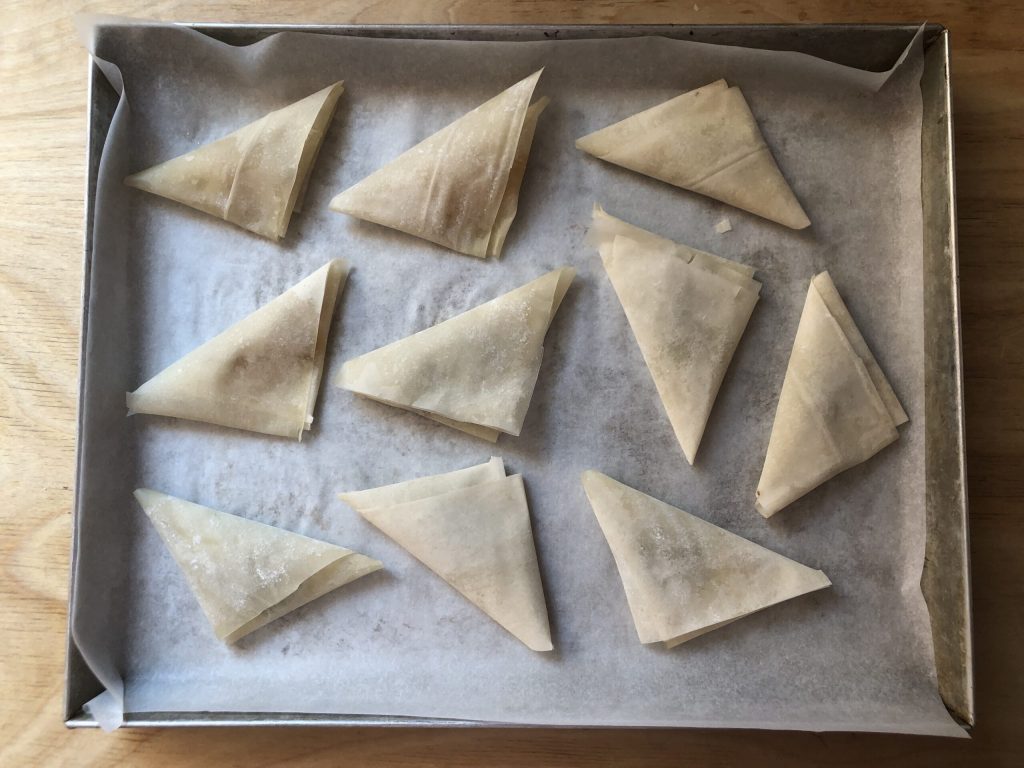 For this recipe, I used four phyllo sheets measuring 14.5 x 9.8 inches. You will need two sheets to make five triangles.