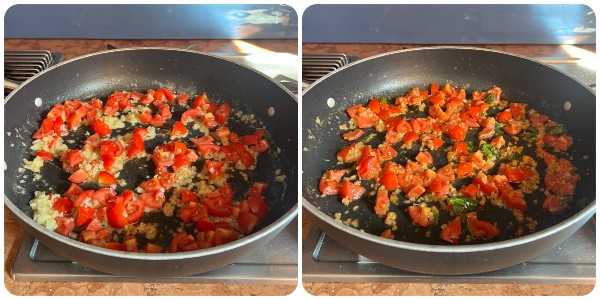 Add the cherry tomatoes to the sauté and cook for 10/15 minutes over low heat until the sauce becomes a bit dense. Salt to taste and add some basil leaves torn by hand. Let everything flavor for a couple of minutes, then turn off the heat.