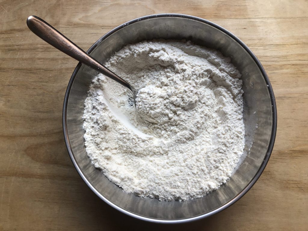 • Once all the eggs have been added, incorporate the dry ingredients by sifting them through a fine mesh sieve and alternating them with the pineapple syrup.