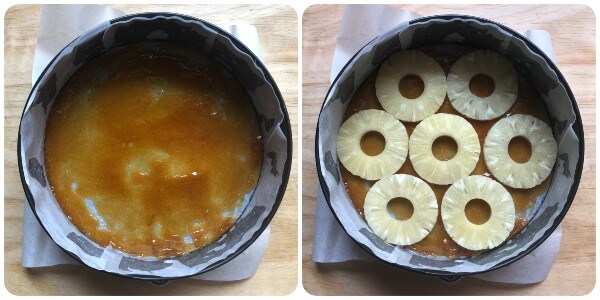• Then pour it onto the bottom of the cake pan and spread it IMMEDIATELY with a spatula. Then distribute 7 pineapple slices on top.