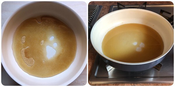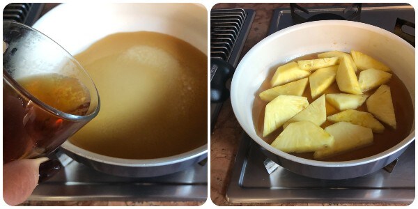 When the sugar has dissolved perfectly, pour the Amaretto liqueur into the pan and add the pineapple pieces.