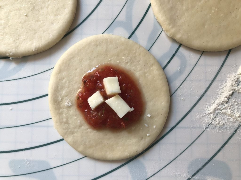 Place a little seasoned tomato and a few mozzarella cubes in the center of each circle: do not overdo it, otherwise it will be difficult to form the bite.
