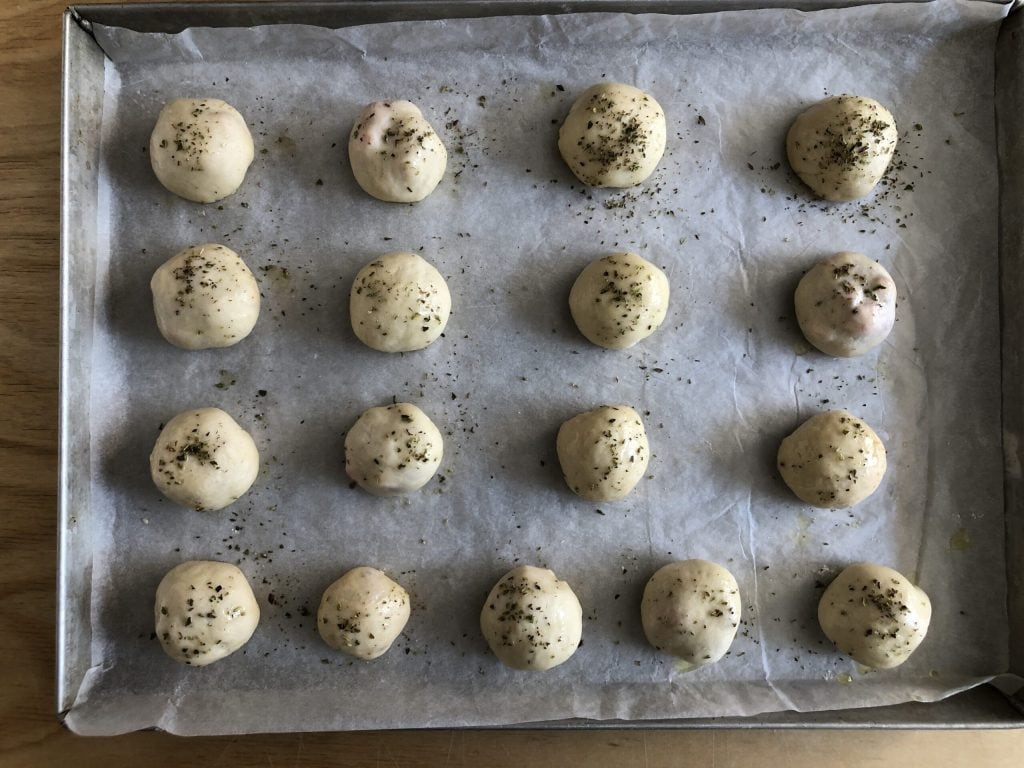 Finally, brush them with a bit of oil and sprinkle with oregano. If you want pink bites instead of white, mix a hint of tomato paste or pulp with the oil.