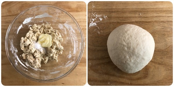 When the dough has compacted, add the soft butter and salt, and continue to work it first in the bowl and then on a lightly floured pastry board. The dough should become smooth and homogeneous. Shape into a ball.