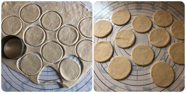 Using a pastry cutter or a glass with a diameter of 3 inches, cut out circles. Remove the excess dough, knead it again, and set it aside because it can be rolled out again to make more circles.