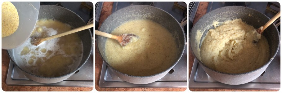 • Pour the water into a saucepan, salt to taste, and bring it to a boil. When it boils, sprinkle in the polenta flour while continuing to stir with a wooden spoon. Continue cooking for the time indicated on the package.