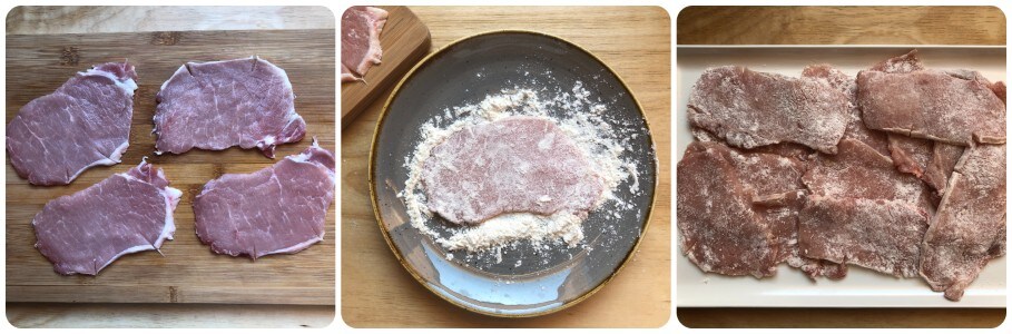 Lightly pound the pork loin slices to thin them a bit and make small incisions on the sides so they don’t curl during cooking.