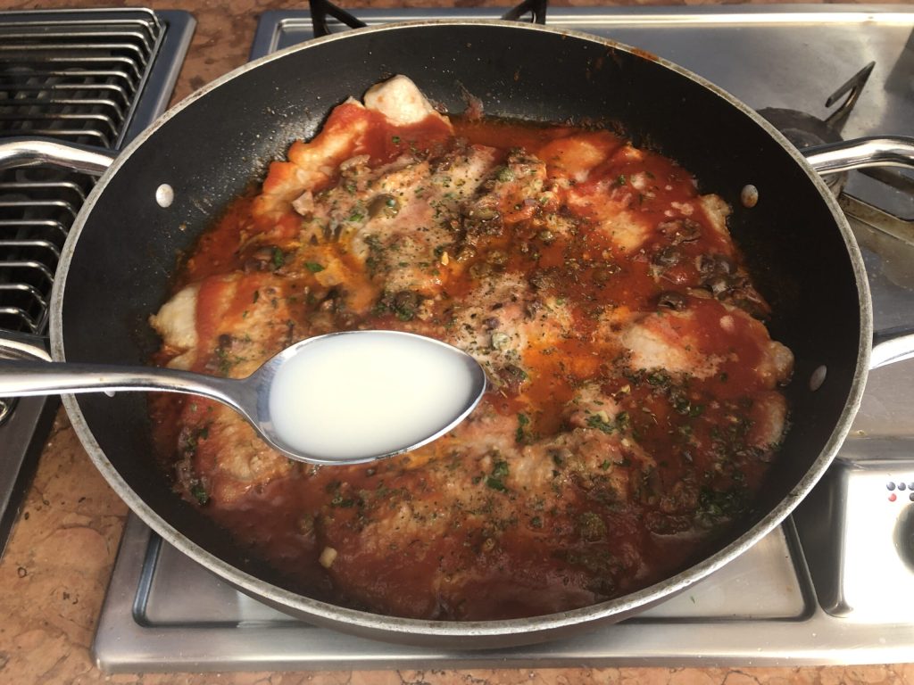 Season the meat slices with a pinch of salt, then pour the tomato puree, chopped olives and capers, and the parsley and garlic mixture into the skillet.
