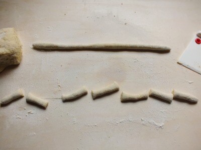Knead the dough a little more, then take small amounts and, on a floured surface, form small rolls. Cut each roll into pieces about 2.5 inches long.