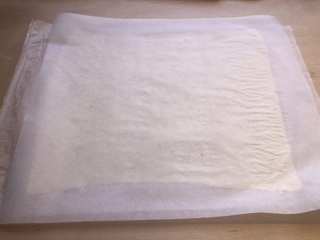 Then cover with another sheet of baking paper and, with a swift motion, flip the puff pastry rectangle over so that the side with the seeds is facing down.