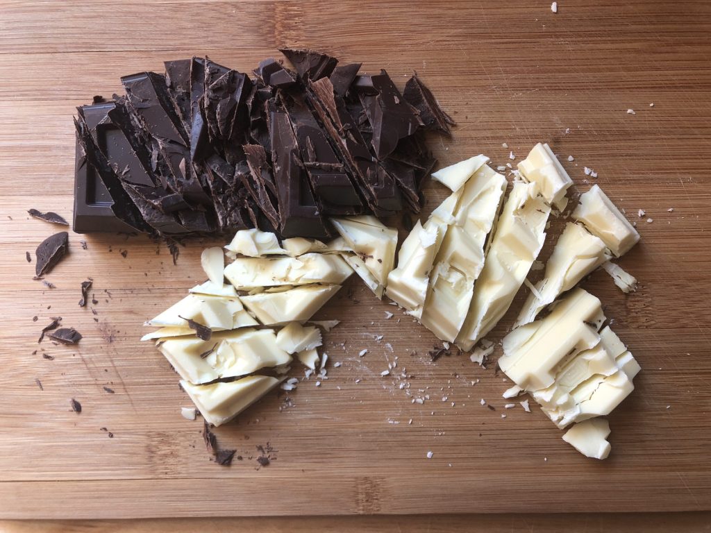 Place them in a bowl, add butter, and melt everything in a bain-marie or microwave.