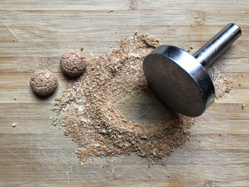 Crush the amaretti into a fine powder using a meat mallet (or a glass).