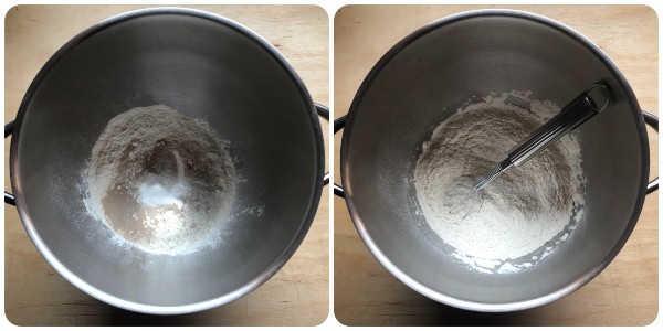 • In the bowl of the stand mixer, place the flour, the dry yeast and the sugar and mix briefly with a small whisk by hand.