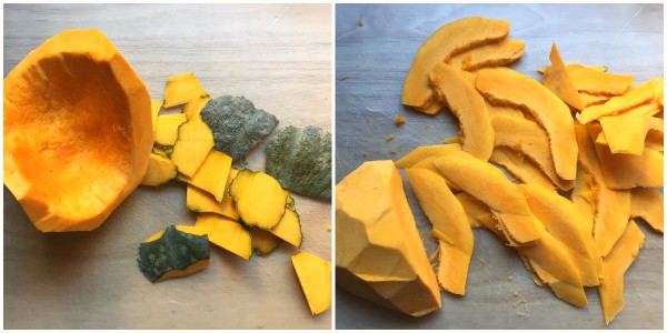 Clean the pumpkin by removing the seeds, the inner fibers and all the rind. Wash it and dry it by patting with kitchen paper. Then cut it into thin slices with a knife or a vegetable peeler. Remember not to throw away the peel because it’s delicious. Read HERE to see how you can use it.