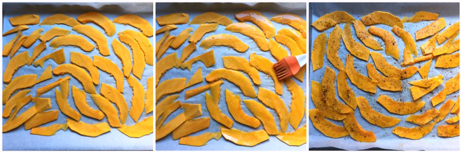Arrange the pumpkin slices on the baking tray lined with parchment paper and brush them with a drizzle of oil.