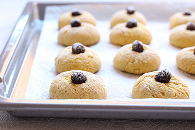 At this point, take 1 oz of the mixture with floured hands and shape it into a ball. Continue this way until the dough is used up, and place the balls on a baking sheet lined with parchment paper.