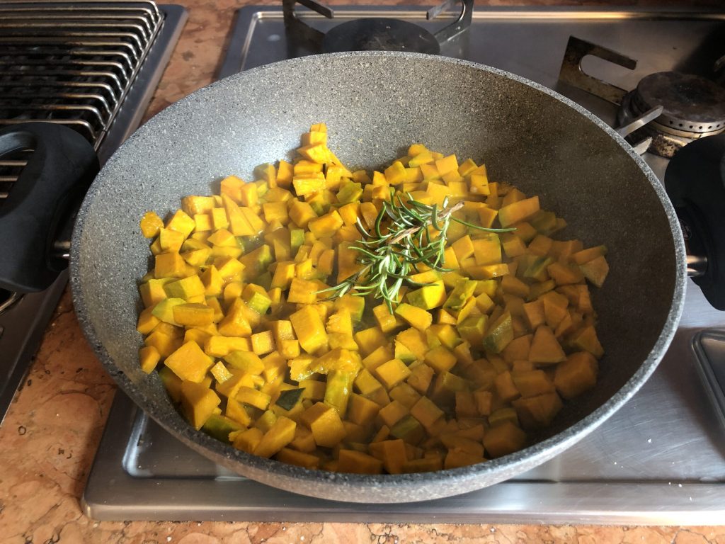 In a pan, heat a few tablespoons of oil, then add the pumpkin, a pinch of salt, a couple of tablespoons of hot broth, and a sprig of rosemary.