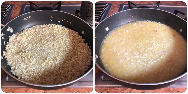 In a second pan, heat a few tablespoons of oil and sauté the shallot over low heat. Then add the rice and let it toast for a couple of minutes.