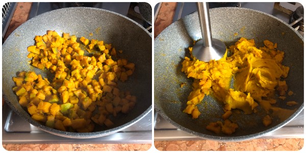 Cook over medium-low heat until the pumpkin is soft, adding more broth if necessary. Then remove the rosemary and blend the pumpkin with a hand blender, keeping some cubes whole. Set aside.