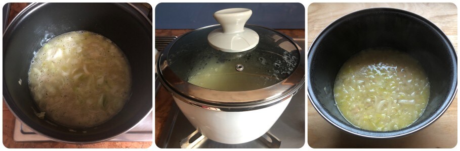 • At this point, pour the hot broth into the saucepan, cover it, and continue cooking over low heat for 15 minutes, stirring occasionally.